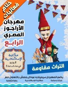 تنظم فرقة ومضة برئاسة الدكتور نبيل بهجت حفل ختام مهرجان الاراجوز المصري في دورته الرابعة والذي يأتي تحت شعار “اقتصاديات التراث” وذلك اليوم الثلاثاء الموافق 8 يوليو الجاري في مكتبة الإسكندرية بمجموعة من العروض الفنية والتراثية’ في تمام الساعة الخامسة مساء.