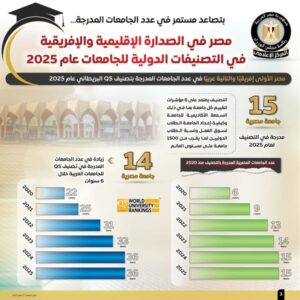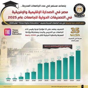 وأظهرت الإنفوجرافات، أن مصر تصدرت الدول العربية والإفريقية في عدد الجامعات المدرجة بتصنيف “Times Higher Education” لعام 2025، الذي يقيم أكثر من 2000 جامعة استنادًا إلى 13 مؤشرًا فرعيًا تشمل مجالات التدريس، والبحث، وإتاحة المعرفة، والنظرة الدولية.