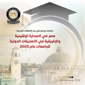 نشر المركز الإعلامي لمجلس الوزراء عددًا من الإنفوجرافات على منصاته الرسمية، استعرض من خلالها حجم التقدم الذي أحرزته الجامعات المصرية في التصنيفات الدولية، في ظل التوسع غير المسبوق في إنشاء الجامعات وتطوير منظومة التعليم العالي، حيث تواصل الدولة جهودها لتعزيز جودة التعليم ورفع كفاءة مؤسساته، ما انعكس على القفزة النوعية للجامعات المصرية ضمن أبرز التصنيفات الدولية لعام 2025، لترسخ مصر بذلك مكانتها الأكاديمية عربيًا وإفريقيًا، وتؤكد نجاحها في بناء نظام تعليم عالي تنافسي ومواكب للمعايير العالمية.