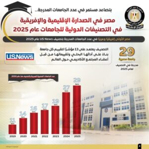 وفي السياق ذاته، أظهرت الإنفوجرافات تصدر مصر الدول العربية والإفريقية في عدد الجامعات المدرجة بتصنيف “US News” لعام 2025، بواقع 29 جامعة، مقارنةً بـ 27جامعة عام 2024، و11 جامعة عام 2019.