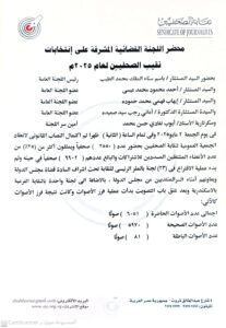 وأعلنت اللجنة القضائية فوز الزميل خالد محمد زكي البلشي نقيبًا للصحفيين لحصوله على عدد (3346) صوتًا وهو ما يزيد على نصف عدد الأصوات الحاضرة.