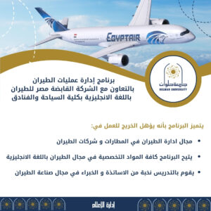 يأتي برنامج إدارة عمليات الطيران بالتعاون مع الشركة القابضة مصر للطيران باللغة الانجليزية بكلية السياحة والفنادق جامعة حلوان في إطار السعي لتحقيق التكامل بين التعليم الأكاديمي والتدريب العملي، مما يعزز من فرص الطلبة في الحصول على تأهيل متميز يتناسب مع متطلبات سوق العمل المحلي والدولي.