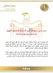 أدانت مصر استهداف البنى الأساسية والمرافق الحيوية في مدينتى بورسودان وكسلا فجر اليوم ٤ مايو ٢٠٢٥.