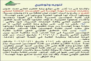نشرت نقابة المهندسين غبر حسابها الرسمي بفيس بوك ما أسمته ” تنویه وتوضیح ” بخصوص الاختبارات المزع عقدها للمهندسين حديثي التخرج في بعض الوظائف المعلنة بمعرفة وزارة التعليم العالي، وجاء كالأتي :