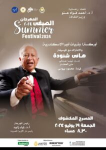 تواصل دار الأوبرا المصرية تحت رعاية الدكتور أحمد فؤاد هنو وزير الثقافة، وبرئاسة الدكتورة لمياء زايد فعاليات مهرجانها الصيفى حيث يقام حفل لأوركسترا وتريات أوبرا الإسكندرية بالإشتراك مع الموسيقار الكبير هانى شنودة بقيادة المايسترو محمود بيومى ومشاركة غنائية “تينا عدلى و منى العطار” وذلك في الثامنة والنصف مساء الجمعة ١٩ يوليو على المسرح المكشوف.