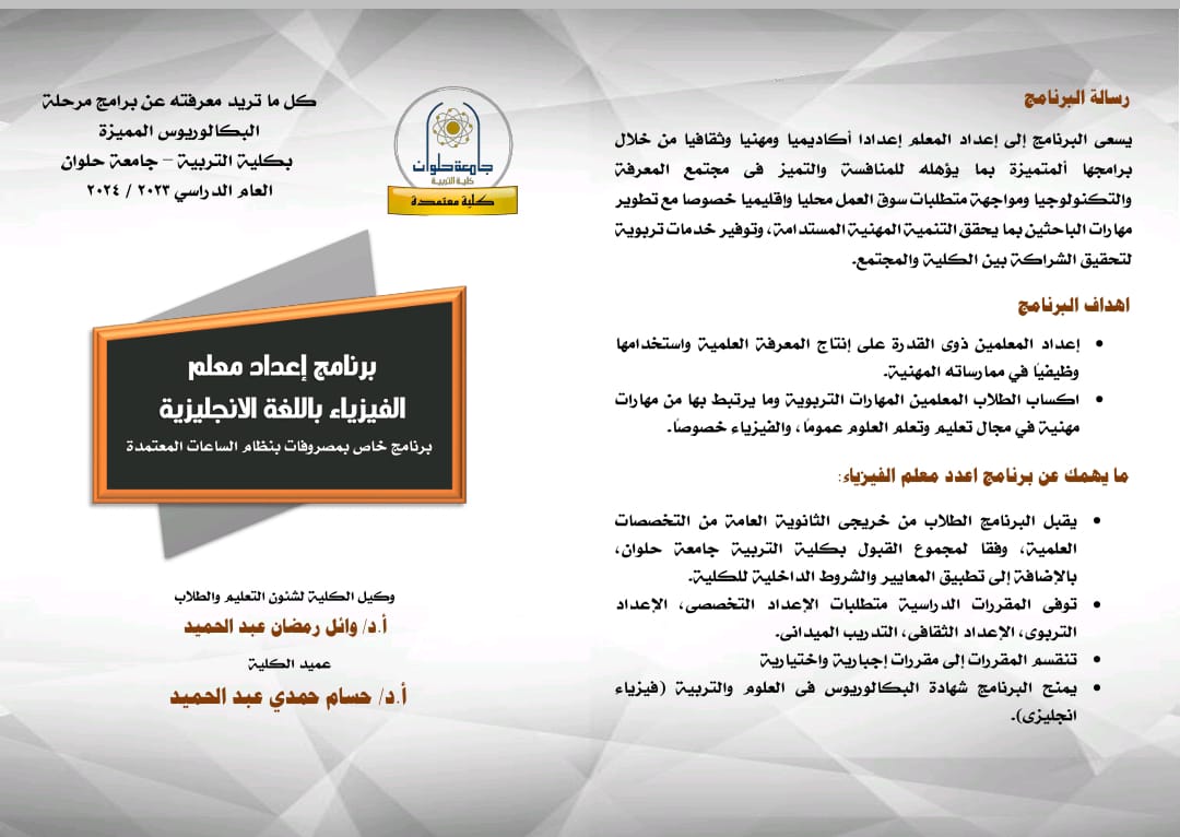 كتبت /دعاء عصام يسعى برنامج إعداد معلم الفيزياء باللغة الانجليزية – برنامج خاص بمصروفات بنظام الساعات المعتمدة – بكلية التربية جامعة حلوان إلى إعداد المعلم إعدادا أكاديميا ومهنيا وثقافيا من […]